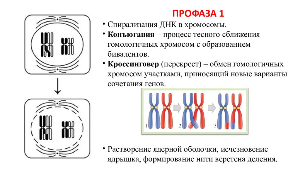 ПРОФАЗА 1 Спирализация ДНК в хромосомы. Конъюгация – процесс тесного сближения гомологичных хромосом с образованием бивалентов. Кроссинговер (перекрест) – обмен гомологичных хромосом участками, приносящий новые варианты сочетания генов. Растворение ядерной оболочки, исчезновение ядрышка, формирование нити веретена деления.