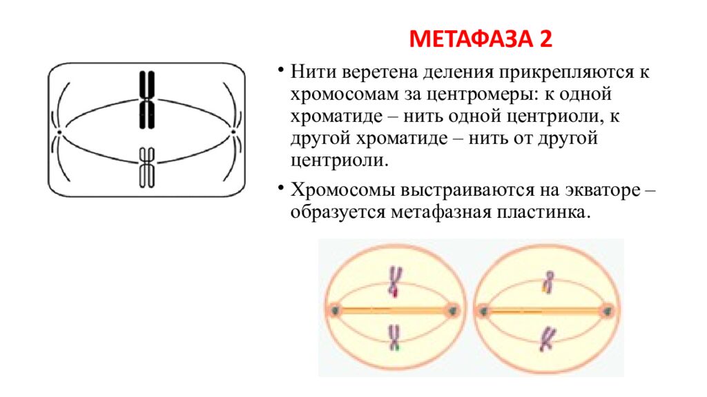 МЕТАФАЗА 2 Нити веретена деления прикрепляются к хромосомам за центромеры : к одной хроматиде – нить одной центриоли, к другой хроматиде – нить от другой центриоли. Хромосомы выстраиваются на экваторе – образуется метафазная пластинка.