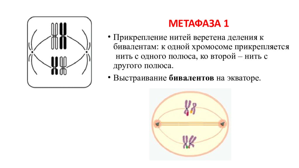 МЕТАФАЗА 1 Прикрепление нитей веретена деления к бивалентам: к одной хромосоме прикрепляется нить с одного полюса, ко второй – нить с другого полюса. Выстраивание бивалентов на экваторе.