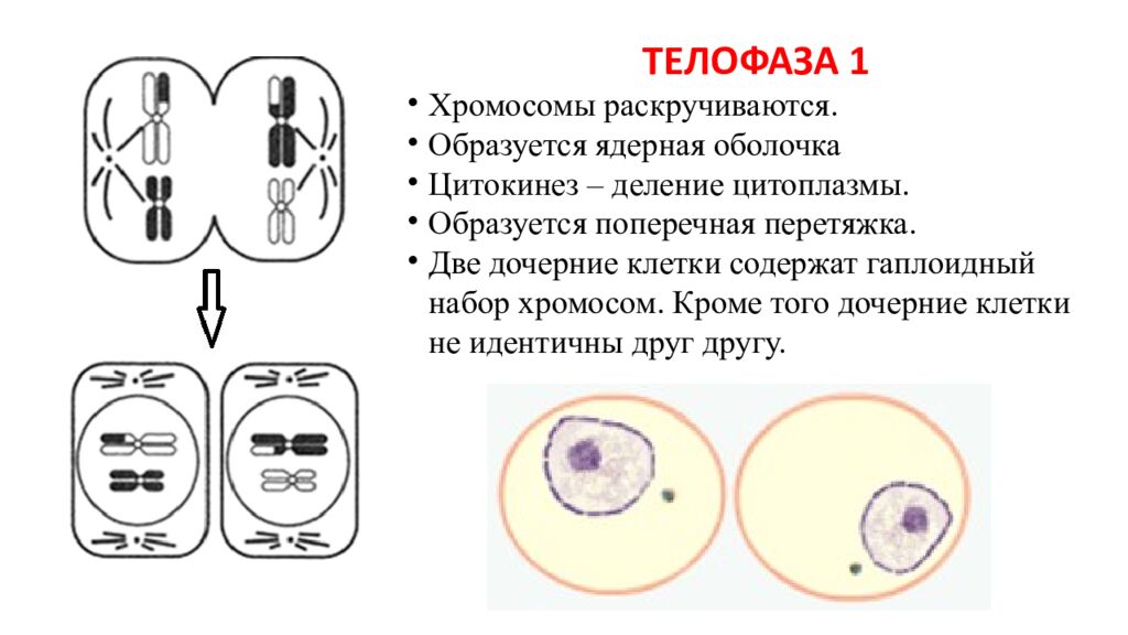ТЕЛОФАЗА 1 Хромосомы раскручиваются. Образуется ядерная оболочка Цитокинез – деление цитоплазмы. Образуется поперечная перетяжка. Две дочерние клетки содержат гаплоидный набор хромосом. Кроме того дочерние клетки не идентичны друг другу.