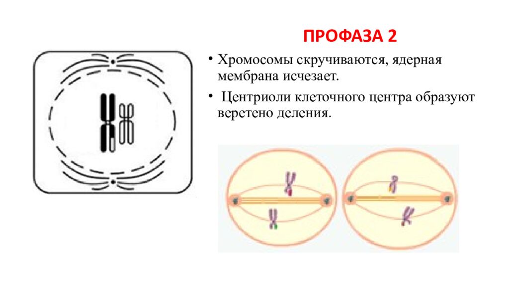 ПРОФАЗА 2 Хромосомы скручиваются, ядерная мембрана исчезает. Центриоли клеточного центра образуют веретено деления.