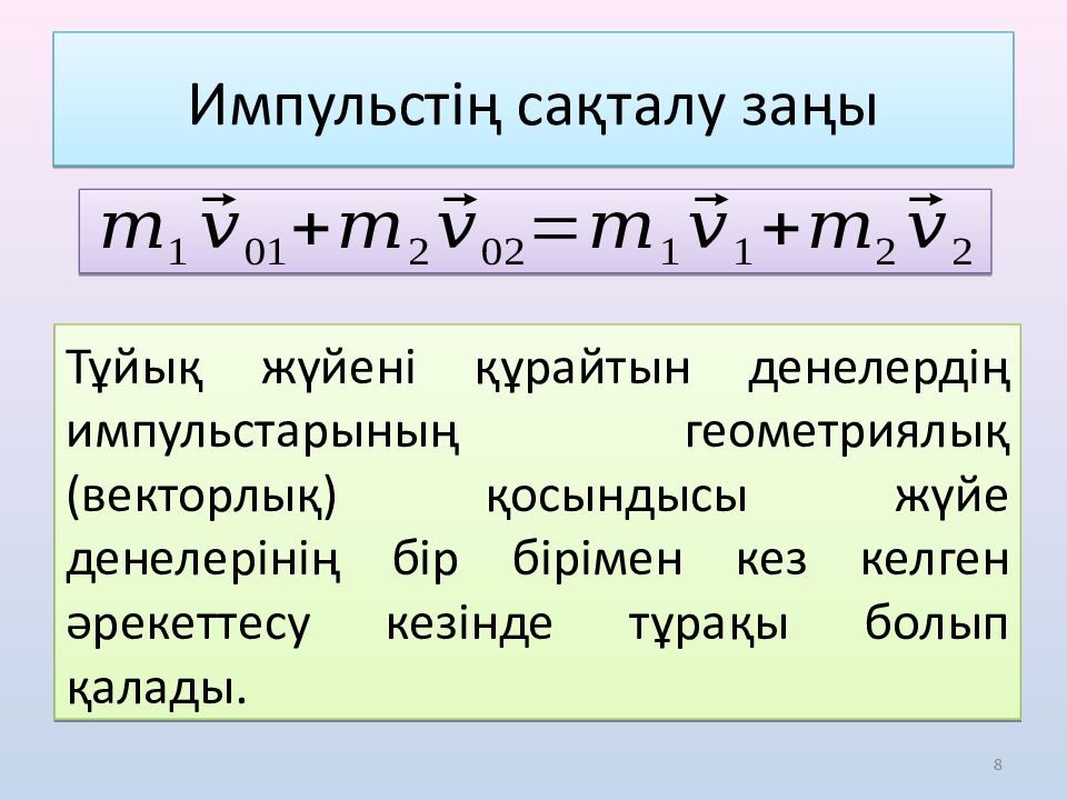 8 Импульстің сақталу заңы Тұйық жүйені құрайтын денелердің импульстарының геометриялық ( векторлық ) қосындысы жүйе денелерінің бір бірімен кез келген әрекеттесу кезінде тұрақы болып қалады.