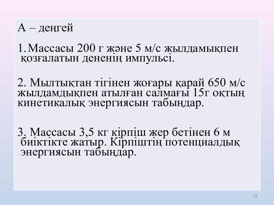 12 А – деңгей Массасы 200 г және 5 м/с жылдамықпен қозғалатын дененің импульсі. 2. Мылтықтан тігінен жоғары қарай 650 м/с жылдамдықпен атылған салмағы 15г оқтың кинетикалық энергиясын табыңдар. 3. Массасы 3,5 кг кірпіш жер бетінен 6 м биіктікте жатыр. Кірпіштің потенциалдық энергиясын табыңдар.