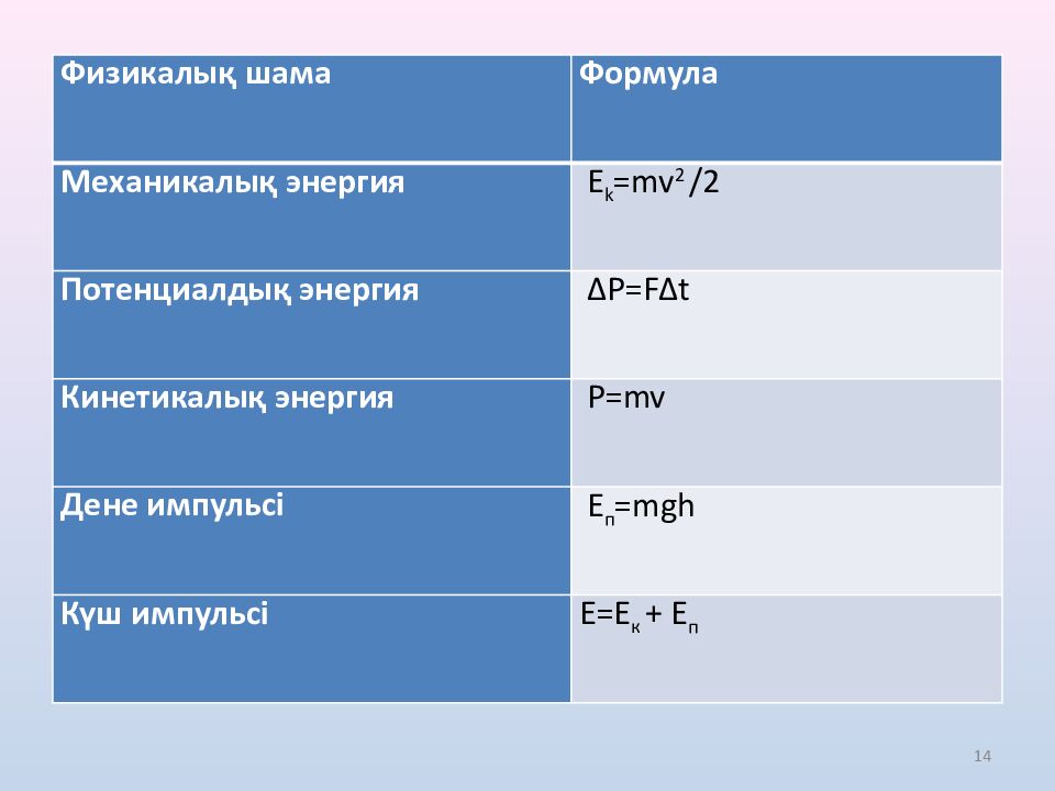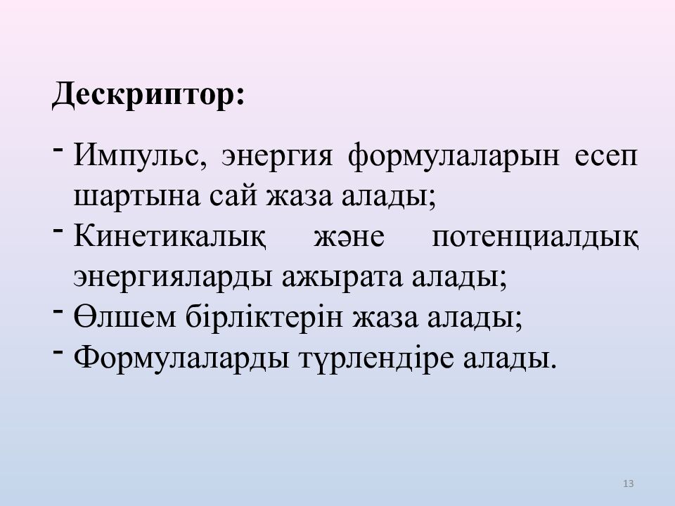 13 Дескриптор: Импульс, энергия формулаларын есеп шартына сай жаза алады; Кинетикалық және потенциалдық энергияларды ажырата алады; Өлшем бірліктерін жаза алады; Формулаларды түрлендіре алады.