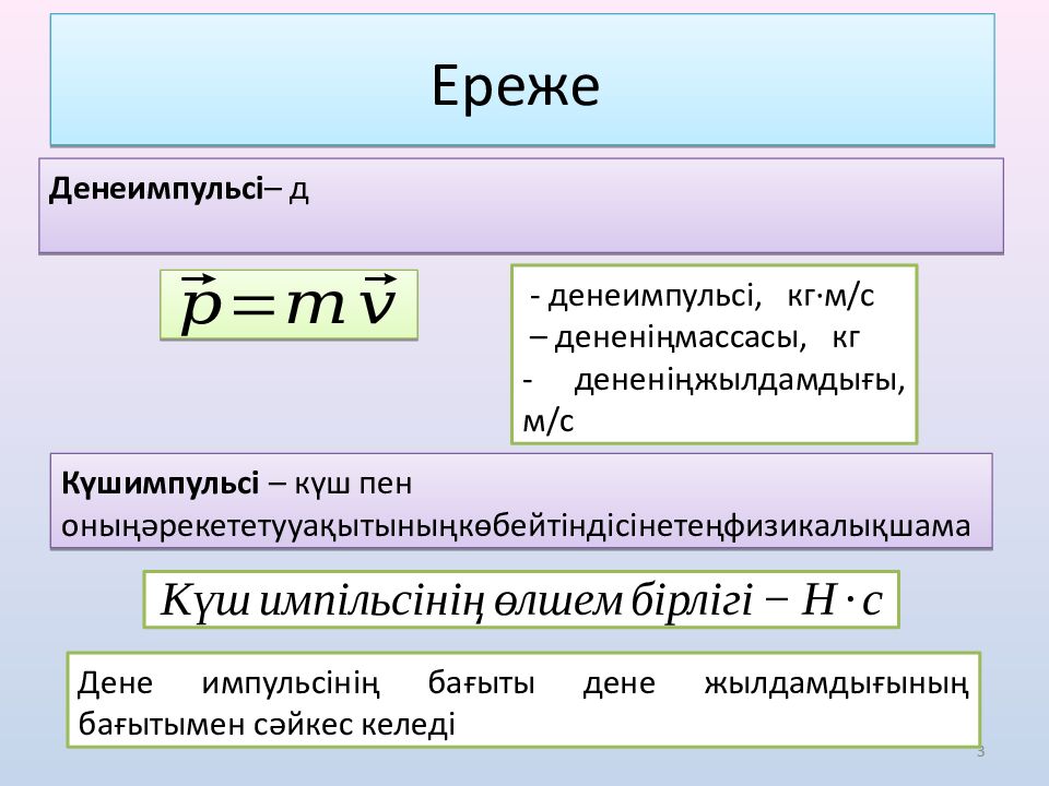 Күш импульсі – күш пен оның әрекет ету уақытының көбейтіндісіне тең физикалық шама Ден е импульсі – д - дене импульсі, кг∙м /с – дененің массасы, кг - дененің жылдамдығы, м/с 3 Дене импульсінің бағыты дене жылдамдығының бағытымен сәйкес келеді