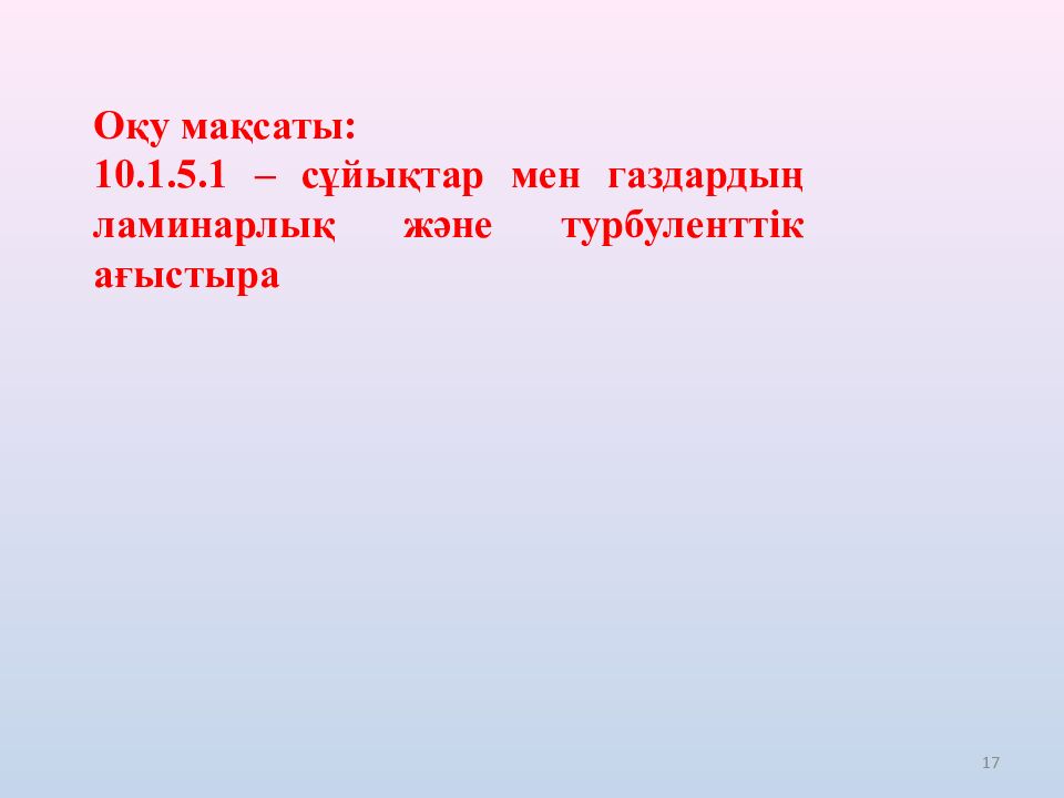 17 Оқу мақсаты: 10.1.5.1 – сұйықтар мен газдардың ламинарлық және турбуленттік ағыстыра