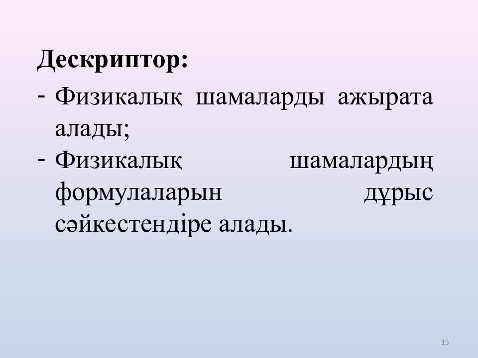 15 Дескриптор: Физикалық шамаларды ажырата алады; Физикалық шамалардың формулаларын дұрыс сәйкестендіре алады.