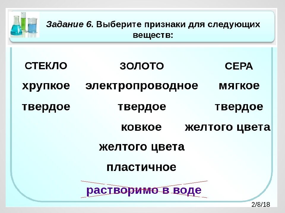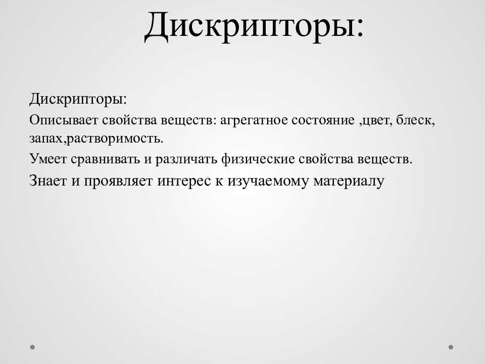 Дискрипторы : Описывает свойства веществ: агрегатное состояние,цвет, блеск, запах,растворимость. Умеет сравнивать и различать физические свойства веществ. Знает и проявляет интерес к изучаемому материалу