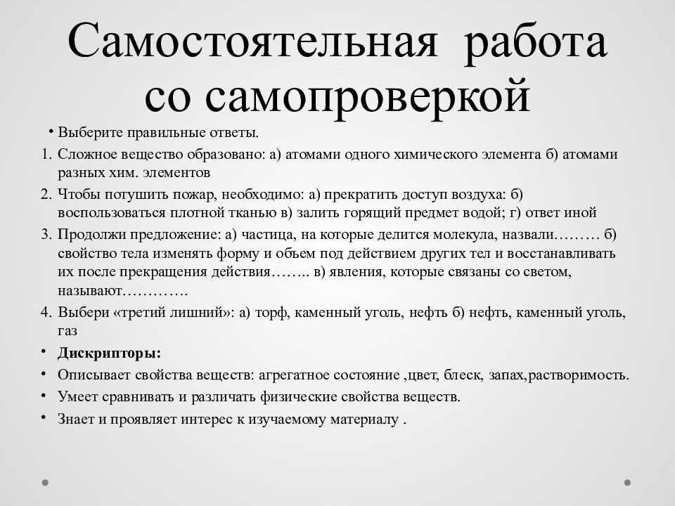 Выберите правильные ответы. Сложное вещество образовано: а) атомами одного химического элемента б) атомами разных хим. элементов Чтобы потушить пожар, необходимо: а) прекратить доступ воздуха: б) воспользоваться плотной тканью в) залить горящий предмет водой; г) ответ иной Продолжи предложение: а) частица, на которые делится молекула, назвали……… б) свойство тела изменять форму и объем под действием других тел и восстанавливать их после прекращения действия…….. в) явления, которые связаны со светом, называют…………. Выбери «третий лишний»: а) торф, каменный уголь, нефть б) нефть, каменный уголь, газ Дискрипторы : Описывает свойства веществ: агрегатное состояние,цвет, блеск, запах,растворимость. Умеет сравнивать и различать физические свойства веществ. Знает и проявляет интерес к изучаемому материалу.