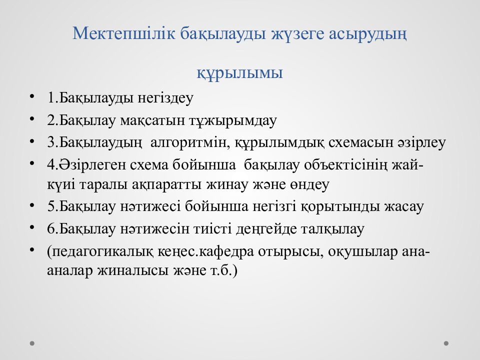 1. Бақылауды негіздеу 2. Бақылау мақсатын тұжырымдау 3. Бақылаудың алгоритмін, құрылымдық схемасын әзірлеу 4. Әзірлеген схема бойынша бақылау объектісінің жай - күиі таралы ақпаратты жинау және өндеу 5. Бақылау нәтижесі бойынша негізгі қорытынды жасау 6. Бақылау нәтижесін тиісті деңгейде талқылау ( педагогикалық кеңес.кафедра отырысы, оқушылар ана - аналар жиналысы және т.б. )