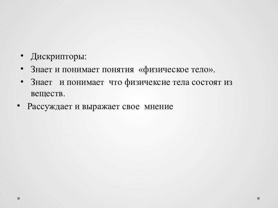 Дискрипторы : Знает и понимает понятия «физическое тело». Знает и понимает что физичексие тела состоят из веществ. Рассуждает и выражает свое мнение