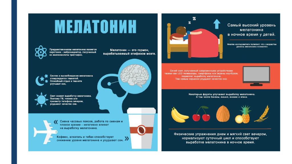 Мелатонин – основной гормон эпифиза (шишковидной железы), вырабатываемый при отсутствии света. Синтезируется из аминокислоты триптофан. Эпифиз (синтез) К ровь и спинномозговая жидкость (транспортировка) Гипоталамус (накопление)