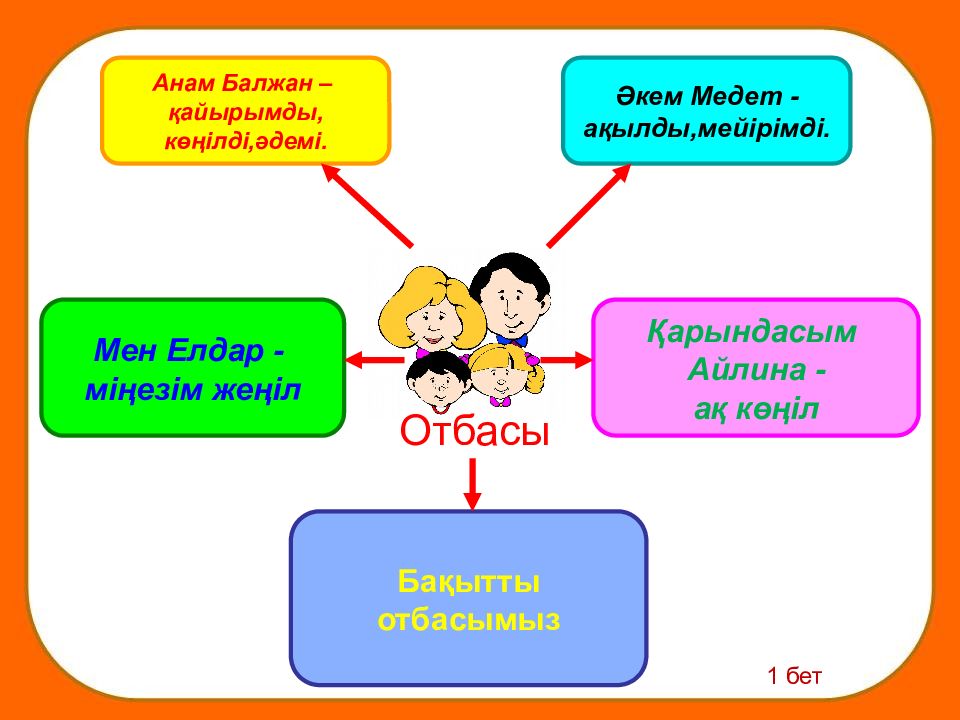 Отбасы Анам Балжан – қайырымды, көңілді,әдемі. Әкем Медет - ақылды,мейірімді. Қарындасым Айлина - ақ көңіл Мен Елдар - міңезім жеңіл Бақытты отбасымыз 1 бет