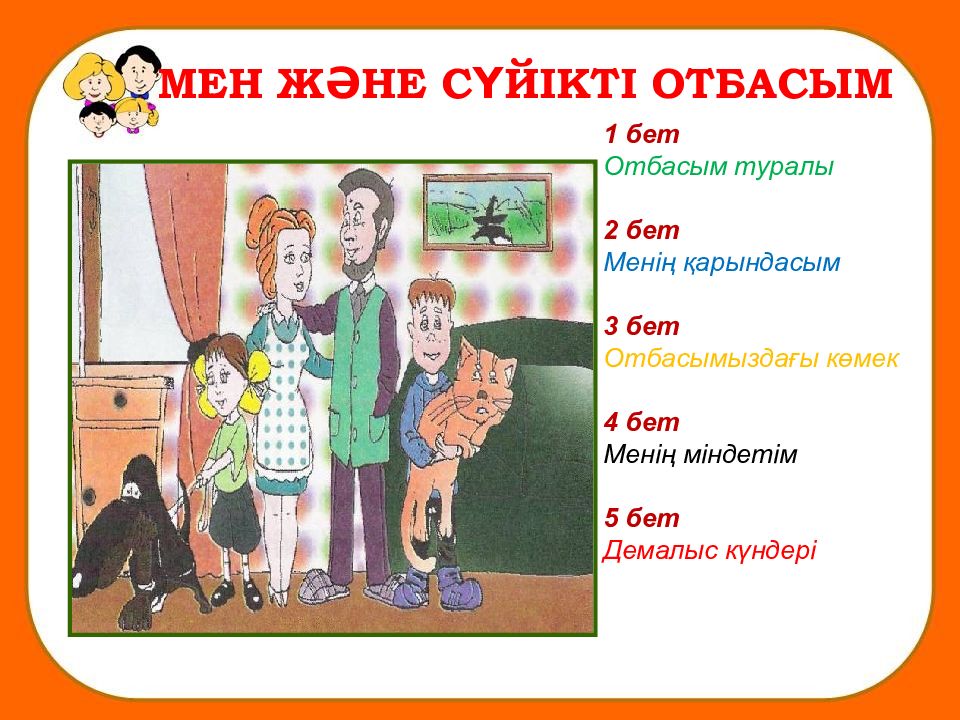 МЕН ЖӘНЕ СҮЙІКТІ ОТБАСЫМ 1 бет Отбасым туралы 2 бет Менің қарындасым 3 бет Отбасымыздағы көмек 4 бет Менің міндетім 5 бет Демалыс күндері