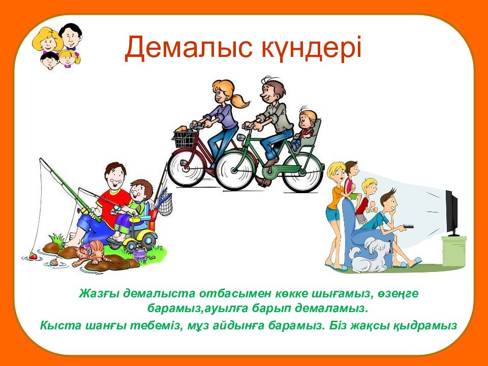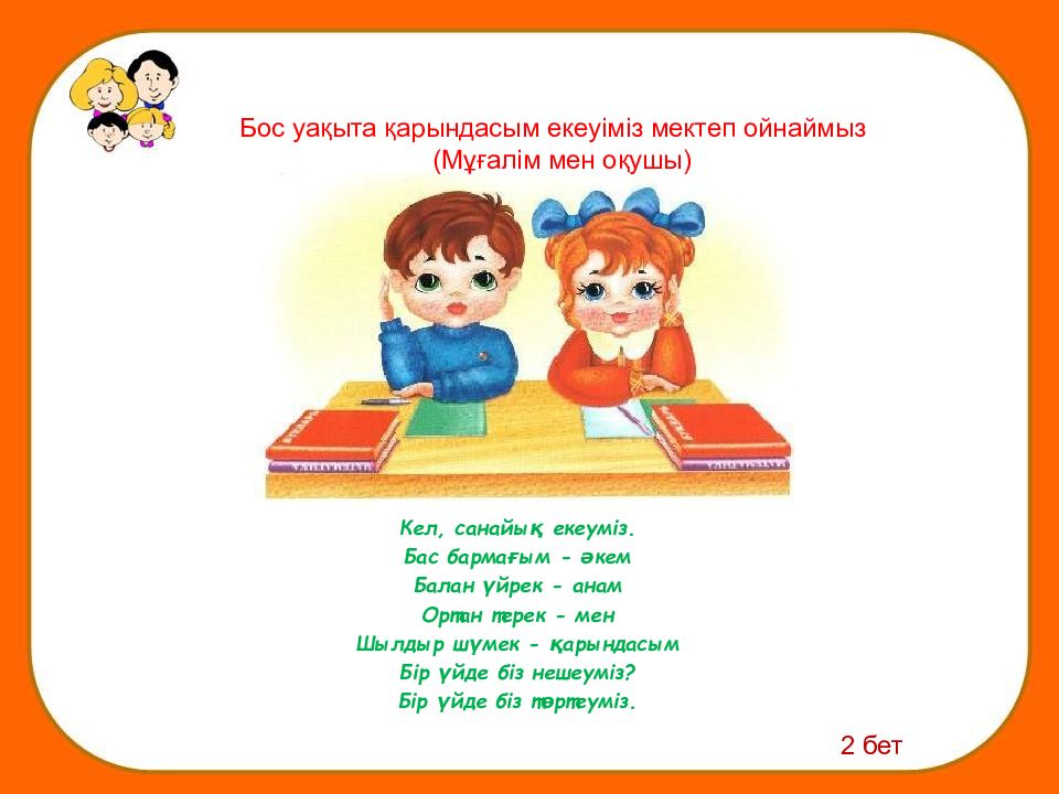 Кел, санайық екеуміз. Бас бармағым - әкем Балан үйрек - анам Ортан терек - мен Шылдыр шүмек - қарындасым Бір үйде біз нешеуміз? Бір үйде біз төртеуміз. Бос уақыта қарындасым екеуіміз мектеп ойнаймыз (Мұғалім мен оқ у шы) 2 бет