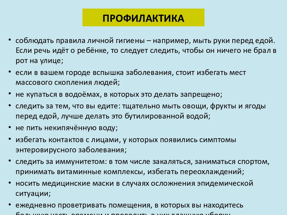 соблюдать правила личной гигиены – например, мыть руки перед едой. Если речь идёт о ребёнке, то следует следить, чтобы он ничего не брал в рот на улице; если в вашем городе вспышка заболевания, стоит избегать мест массового скопления людей; не купаться в водоёмах, в которых это делать запрещено; следить за тем, что вы едите: тщательно мыть овощи, фрукты и ягоды перед едой, лучше делать это бутилированной водой; не пить некипячённую воду; избегать контактов с лицами, у которых появились симптомы энтеровирусного заболевания; следить за иммунитетом: в том числе закаляться, заниматься спортом, принимать витаминные комплексы, избегать переохлаждений; носить медицинские маски в случаях осложнения эпидемической ситуации; ежедневно проветривать помещения, в которых вы находитесь большую часть времени и проводить в них влажную уборку.