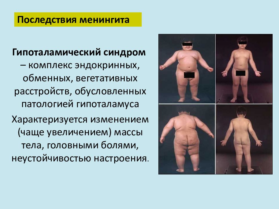 Гипоталамический синдром – комплекс эндокринных, обменных, вегетативных расстройств, обусловленных патологией гипоталамуса Характеризуется изменением (чаще увеличением) массы тела, головными болями, неустойчивостью настроения.