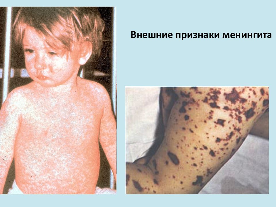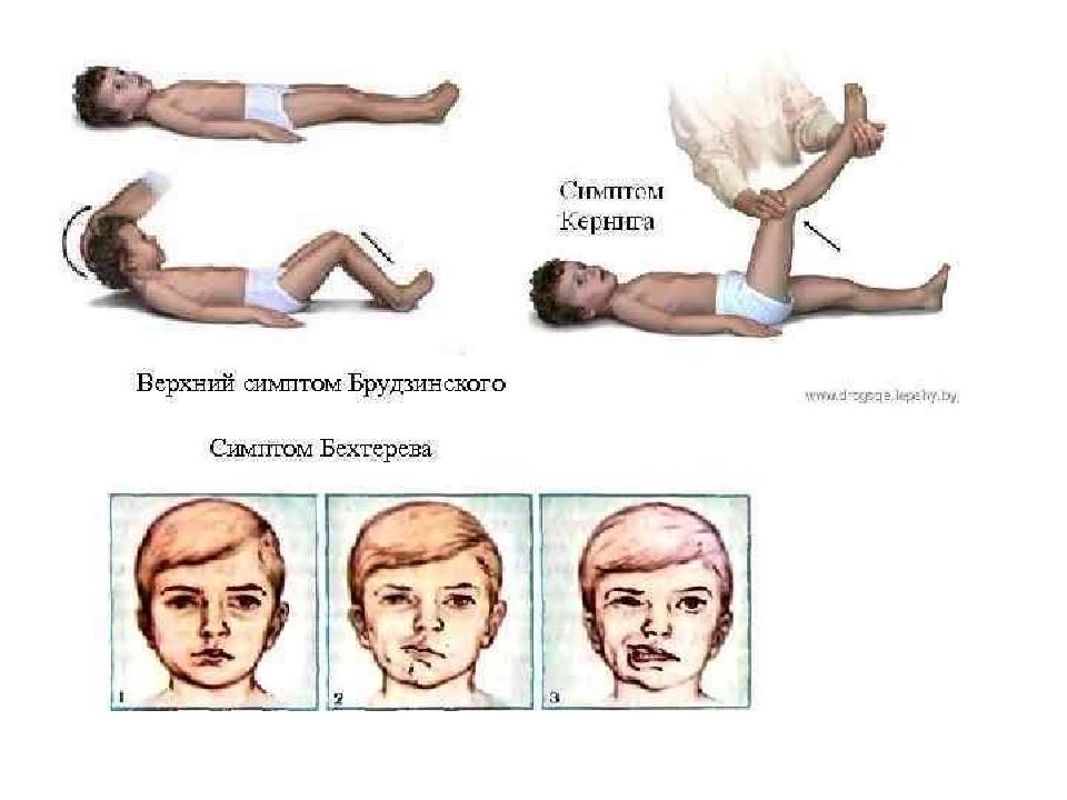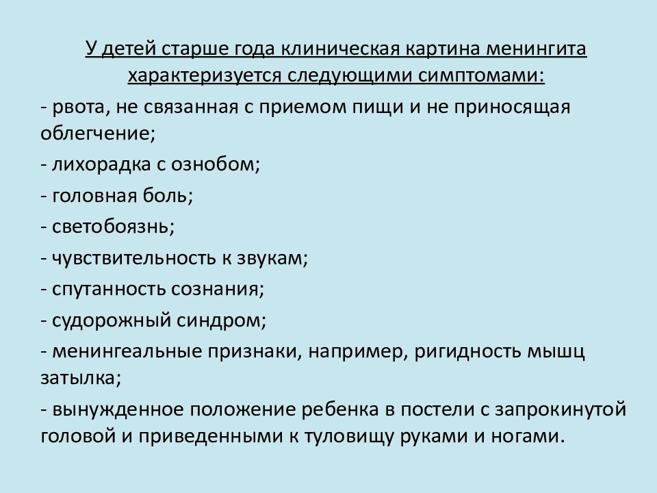 У детей старше года клиническая картина менингита характеризуется следующими симптомами: - рвота, не связанная с приемом пищи и не приносящая облегчение; - лихорадка с ознобом; - головная боль; - светобоязнь ; - чувствительность к звукам; - спутанность сознания; - судорожный синдром; - менингеальные признаки, например, ригидность мышц затылка; - вынужденное положение ребенка в постели с запрокинутой головой и приведенными к туловищу руками и ногами.