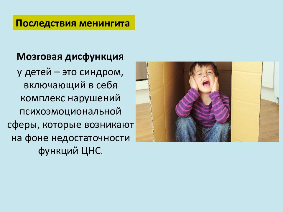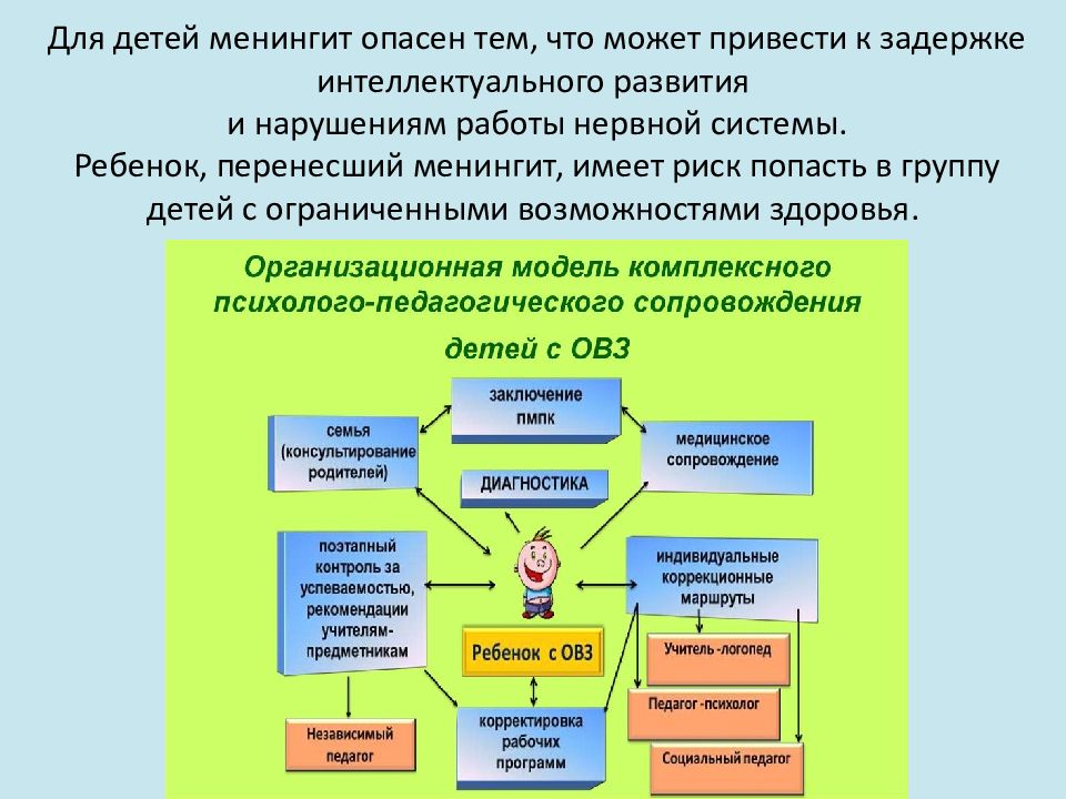 Слайд 24: Для детей менингит опасен тем, что может привести к задержке интеллектуального развития и нарушениям работы нервной системы. Ребенок, перенесший менингит, имеет риск попасть в группу детей с ограниченными возможностями здоровья