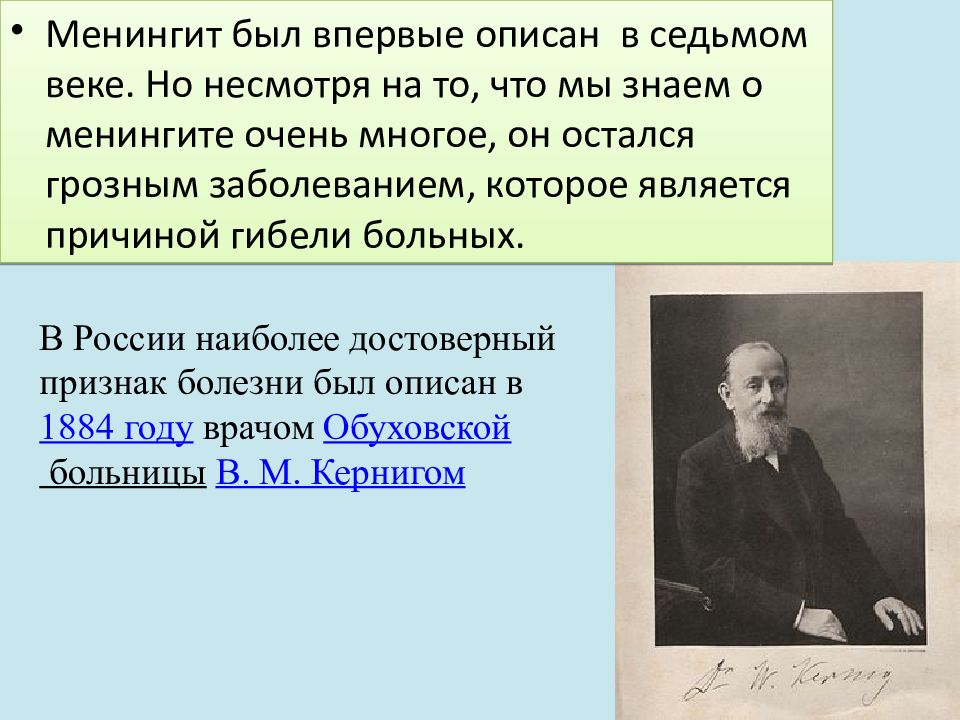 В России наиболее достоверный признак болезни был описан в 1884 году врачом Обуховской больницы В. М. Кернигом Менингит был впервые описан в седьмом веке. Но несмотря на то, что мы знаем о менингите очень многое, он остался грозным заболеванием, которое является причиной гибели больных.