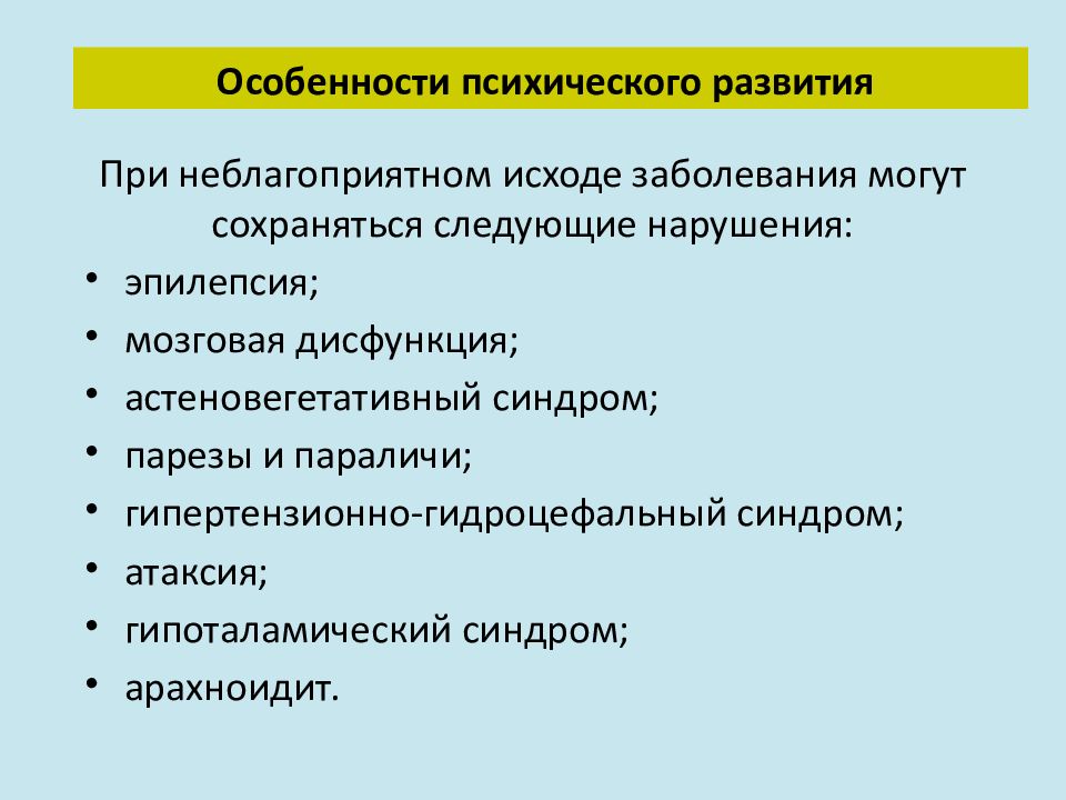 П ри неблагоприятном исходе заболевания могут сохраняться следующие нарушения : эпилепсия; мозговая дисфункция; астеновегетативный синдром; парезы и параличи; гипертензионно-гидроцефальный синдром; атаксия; гипоталамический синдром; арахноидит.