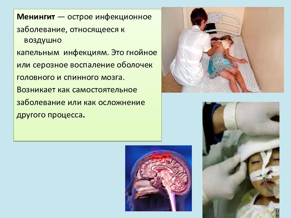 Менингит — острое инфекционное заболевание, относящееся к воздушно капельным инфекциям. Это гнойное или серозное воспаление оболочек головного и спинного мозга. Возникает как самостоятельное заболевание или как осложнение другого процесса.