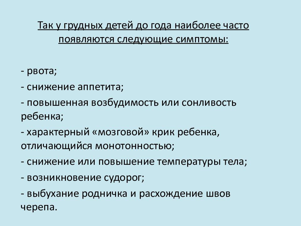 Так у грудных детей до года наиболее часто появляются следующие симптомы : - рвота ; - снижение аппетита; - повышенная возбудимость или сонливость ребенка; - характерный «мозговой» крик ребенка, отличающийся монотонностью; - снижение или повышение температуры тела; - возникновение судорог; - выбухание родничка и расхождение швов черепа.