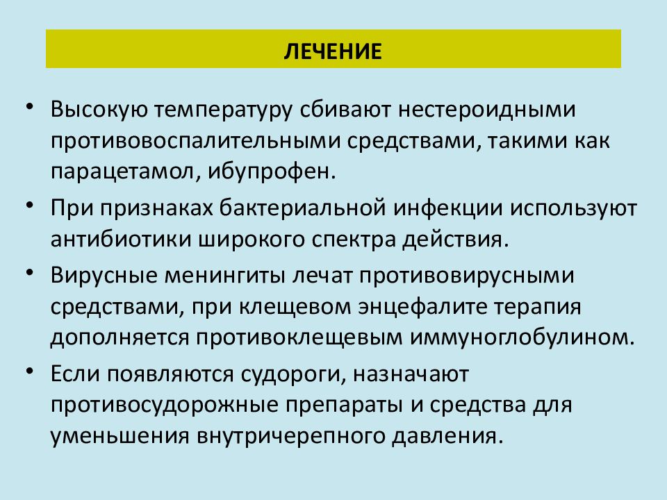 Высокую температуру сбивают нестероидными противовоспалительными средствами, такими как парацетамол, ибупрофен. При признаках бактериальной инфекции используют антибиотики широкого спектра действия. Вирусные менингиты лечат противовирусными средствами, при клещевом энцефалите терапия дополняется противоклещевым иммуноглобулином. Если появляются судороги, назначают противосудорожные препараты и средства для уменьшения внутричерепного давления.