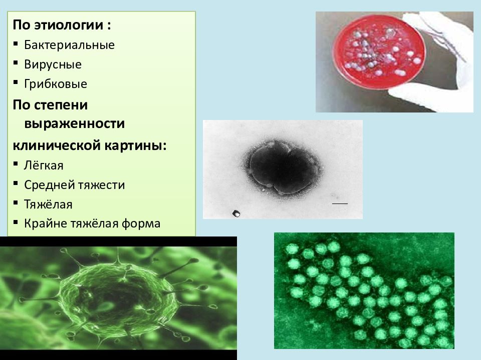 По этиологии : Бактериальные Вирусные Грибковые По степени выраженности клинической картины: Лёгкая Средней тяжести Тяжёлая Крайне тяжёлая форма