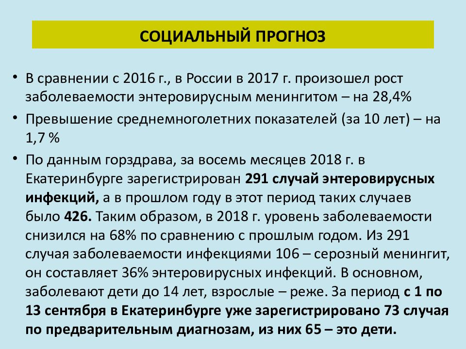 В сравнении с 2016 г., в России в 2017 г. произошел рост заболеваемости энтеровирусным менингитом – на 28,4 % Превышение среднемноголетних показателей (за 10 лет) – на 1,7 % По данным горздрава, за восемь месяцев 2018 г. в Екатеринбурге зарегистрирован 291 случай энтеровирусных инфекций, а в прошлом году в этот период таких случаев было 426. Таким образом, в 2018 г. уровень заболеваемости снизился на 68% по сравнению с прошлым годом. Из 291 случая заболеваемости инфекциями 106 – серозный менингит, он составляет 36% энтеровирусных инфекций. В основном, заболевают дети до 14 лет, взрослые – реже. За период с 1 по 13 сентября в Екатеринбурге уже зарегистрировано 73 случая по предварительным диагнозам, из них 65 – это дети.