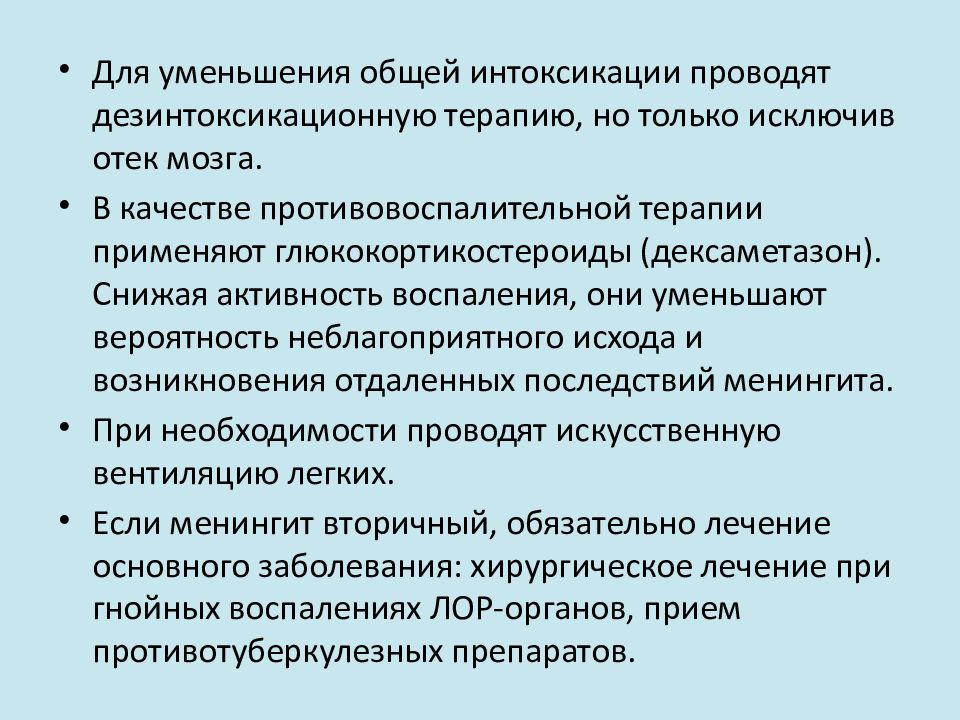 Для уменьшения общей интоксикации проводят дезинтоксикационную терапию, но только исключив отек мозга. В качестве противовоспалительной терапии применяют глюкокортикостероиды ( дексаметазон ). Снижая активность воспаления, они уменьшают вероятность неблагоприятного исхода и возникновения отдаленных последствий менингита. При необходимости проводят искусственную вентиляцию легких. Если менингит вторичный, обязательно лечение основного заболевания: хирургическое лечение при гнойных воспалениях ЛОР-органов, прием противотуберкулезных препаратов.