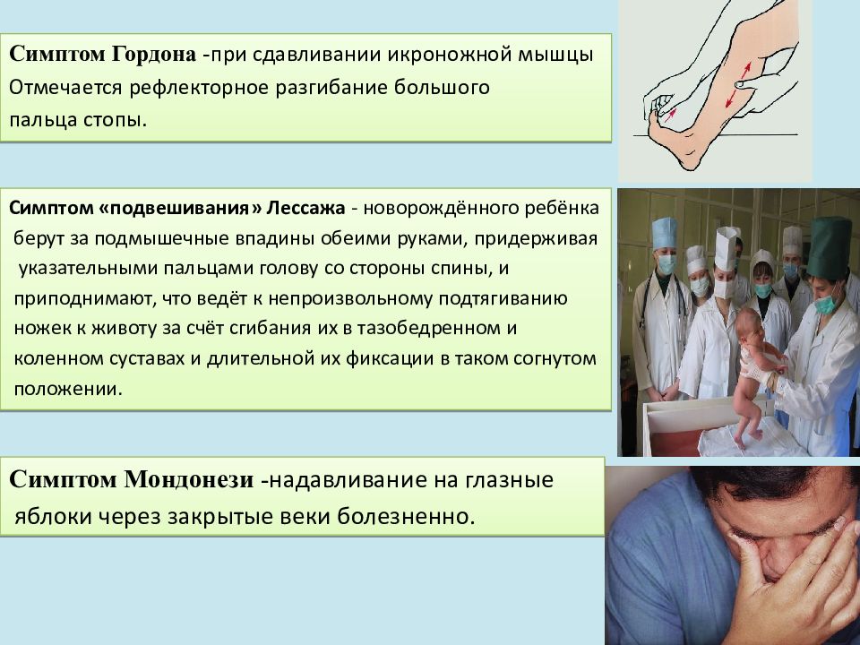Симптом Гордона - при сдавливании икроножной мышцы Отмечается рефлекторное разгибание большого пальца стопы. Симптом «подвешивания» Лессажа - н оворождённого ребёнка берут за подмышечные впадины обеими руками, придерживая указательными пальцами голову со стороны спины, и приподнимают, что ведёт к непроизвольному подтягиванию ножек к животу за счёт сгибания их в тазобедренном и коленном суставах и длительной их фиксации в таком согнутом положении. Симптом Мондонези - надавливание на глазные яблоки через закрытые веки болезненно.