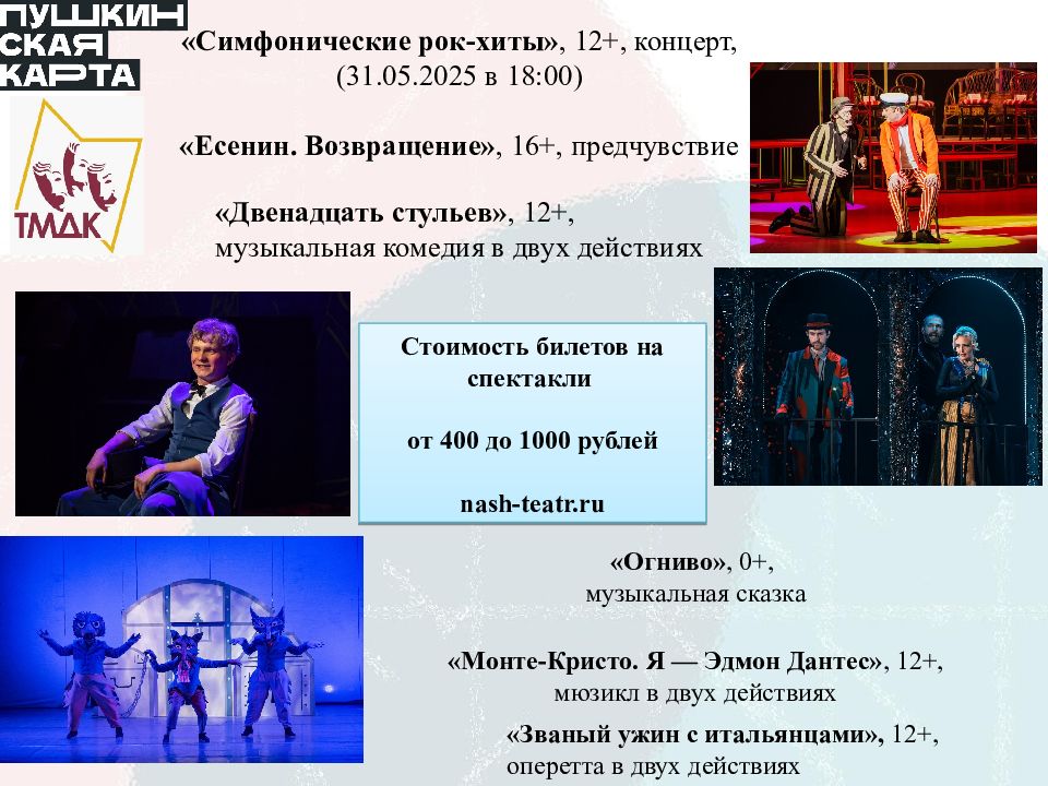 «Двенадцать стульев», 12+, музыкальная комедия в двух действиях «Симфонические рок-хиты», 12+, концерт, (31.05.2025 в 18:00) «Есенин. Возвращение», 16+, предчувствие Стоимость билетов на спектакли от 400 до 1000 рублей nash-teatr.ru «Огниво», 0+, музыкальная сказка «Монте-Кристо. Я — Эдмон Дантес», 12+, мюзикл в двух действиях «Званый ужин с итальянцами», 12+, оперетта в двух действиях