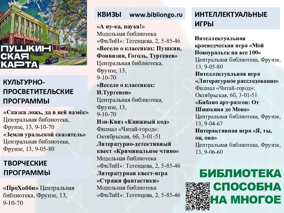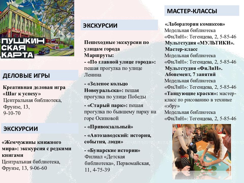 ЭКСКУРСИИ Пешеходные экскурсии по улицам города Маршруты: - « По главной улице города»: пешая прогулка по улице Ленина - « Зеленое кольцо Новоуральска»: пешая прогулка по улице Победы - « Старый парк»: пешая прогулка по бывшему парку на горе Осиновой - «Привокзальный» - «Автозаводский: история, события, люди » - « Бунарские истории» Филиал «Детская библиотека », Первомайская, 11, 4-75-39 «Лаборатория комиксов» Модельная библиотека « ФиЛиН »: Тегенцева, 2, 5-85-46 Мультстудия «МУЛЬТИКИ». Мастер-класс Модельная библиотека « ФиЛиН »: Тегенцева, 2, 5-85-46 Мультстудия « ФиЛиН ». Абонемент, 7 занятий Модельная библиотека « ФиЛиН »: Тегенцева, 2, 5-85-46 « Танцующие краски»: мастер-класс по рисованию в технике « эбру » Модельная библиотека « ФиЛиН »: Тегенцева, 2, 5-85-46 МАСТЕР-КЛАССЫ ДЕЛОВЫЕ ИГРЫ Креативная деловая игра «Шаг к успеху» Центральная библиотека, Фрунзе, 13, 9-10-70 ЭКСКУРСИИ «Жемчужины книжного мира»: экскурсия с редкими книгами Центральная библиотека, Фрунзе, 13, 9-06-60