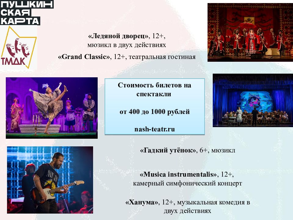 «Ледяной дворец», 12+, мюзикл в двух действиях «Grand Classic», 12+, театральная гостиная «Гадкий утёнок», 6+, мюзикл «Ханума», 12+, музыкальная комедия в двух действиях Стоимость билетов на спектакли от 400 до 1000 рублей nash-teatr.ru «Musica instrumentalis», 12+, камерный симфонический концерт