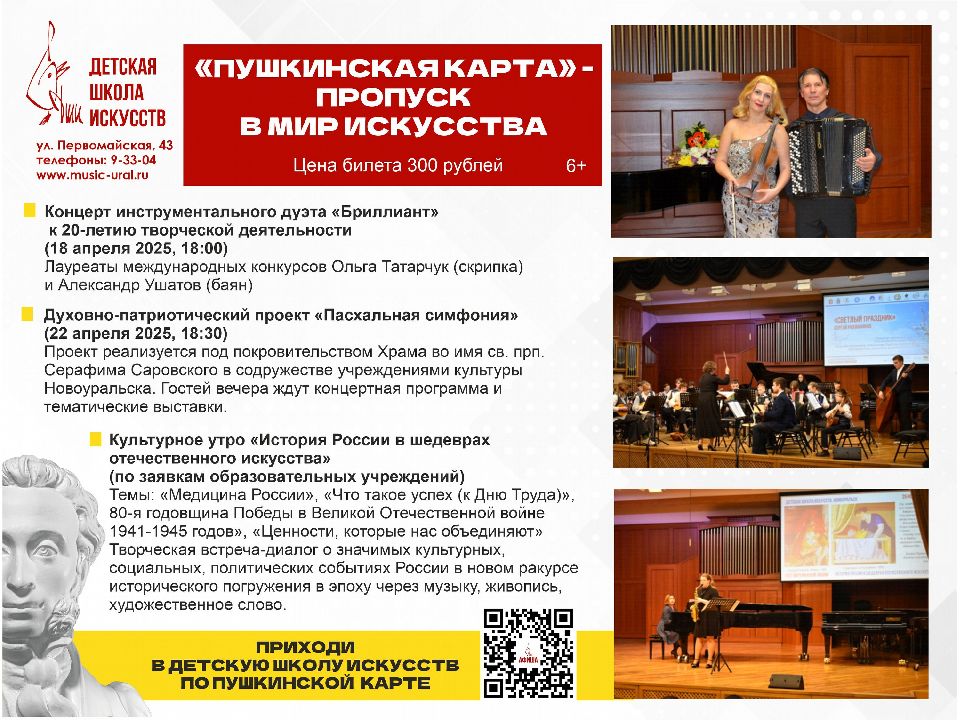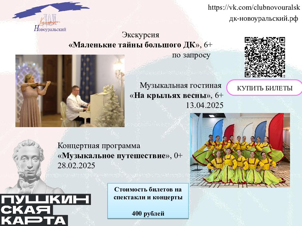 КУПИТЬ БИЛЕТЫ Стоимость билетов на спектакли и концерты 400 рублей дк-новоуральский.рф Экскурсия « Маленькие тайны большого ДК », 6+ по запросу Музыкальная гостиная « На крыльях весны », 6+ 13.04.2025 Концертная программа « Музыкальное путешествие », 0+ 28.02.2025 https://vk.com/clubnovouralsk
