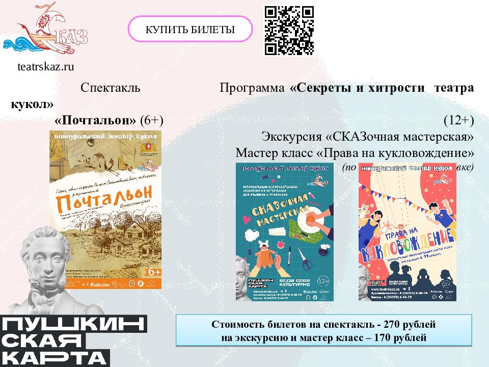 Спектакль Программа «Секреты и хитрости театра кукол» «Почтальон» (6+) (12+) май 2025 Экскурсия «СКАЗочная мастерская» Мастер класс «Права на кукловождение» (по предварительной заявке) КУПИТЬ БИЛЕТЫ Стоимость билетов на спектакль - 270 рублей на экскурсию и мастер класс – 170 рублей teatrskaz.ru