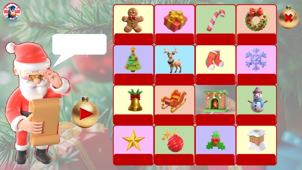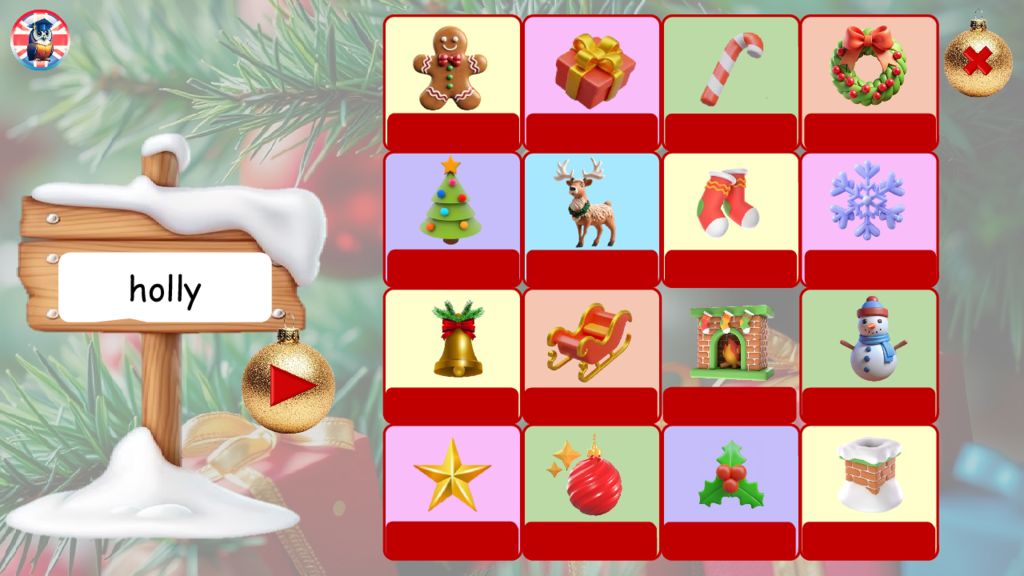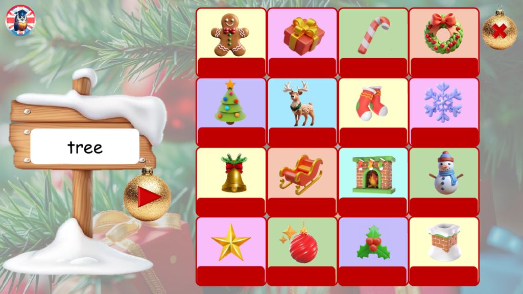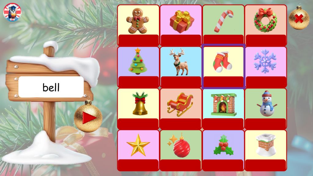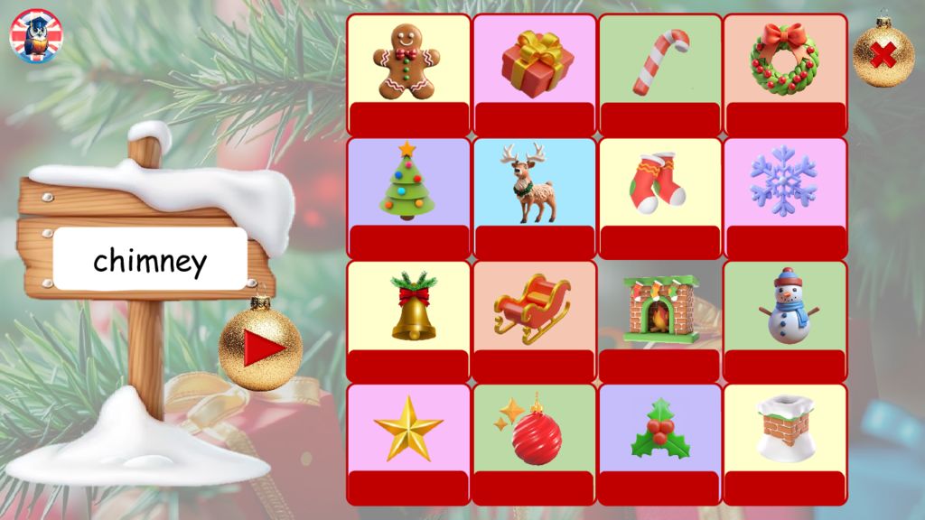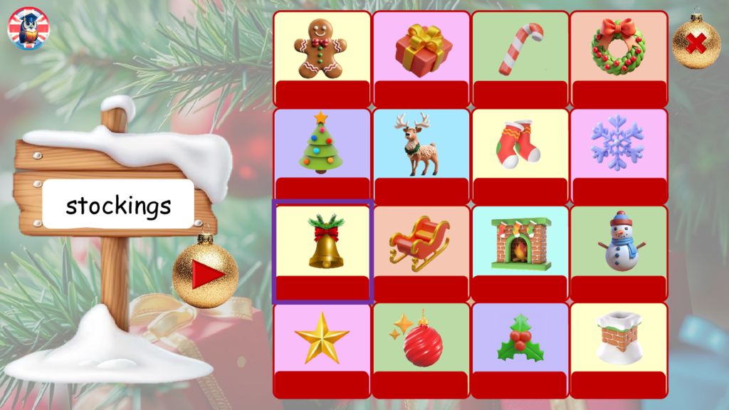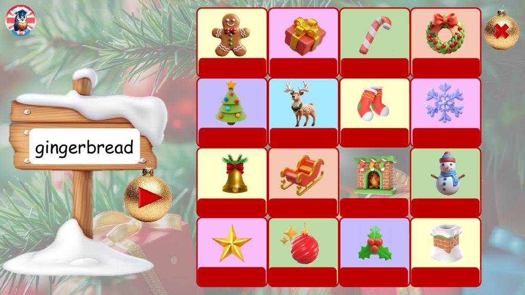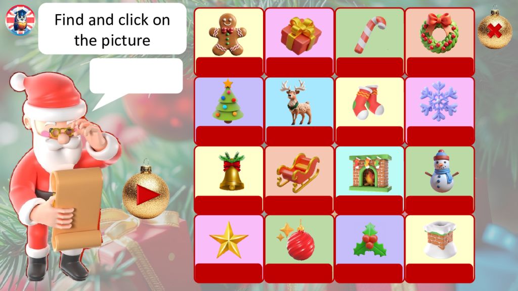 gingerbread present candy cane tree reindeer stockings bell sleigh fireplace star bauble holly wreath snowflake snowman chimney Find and click on the picture