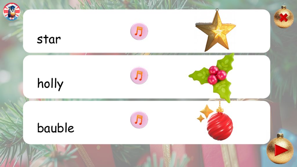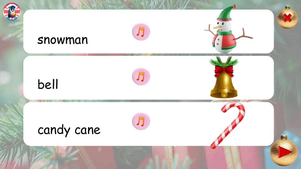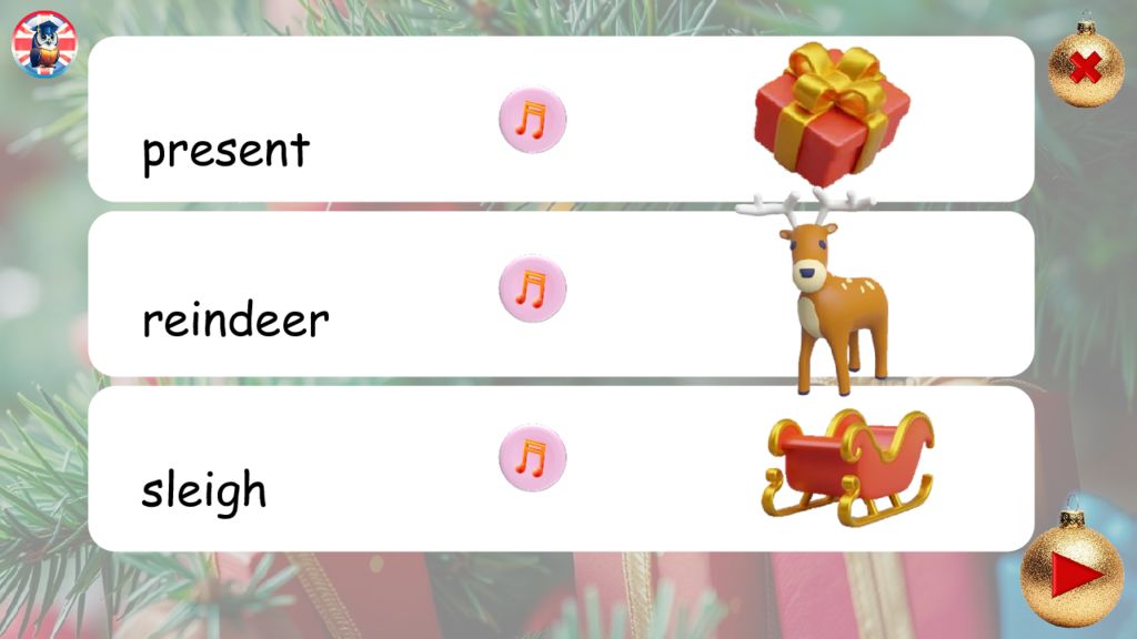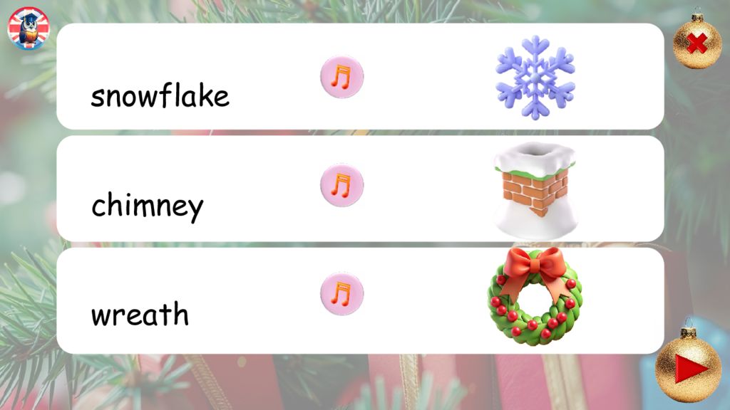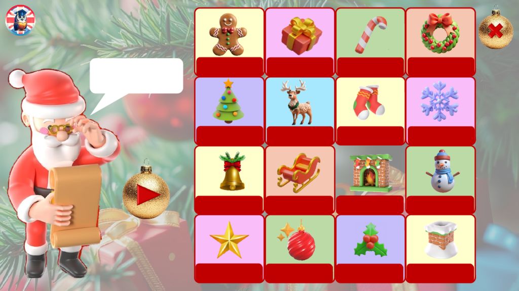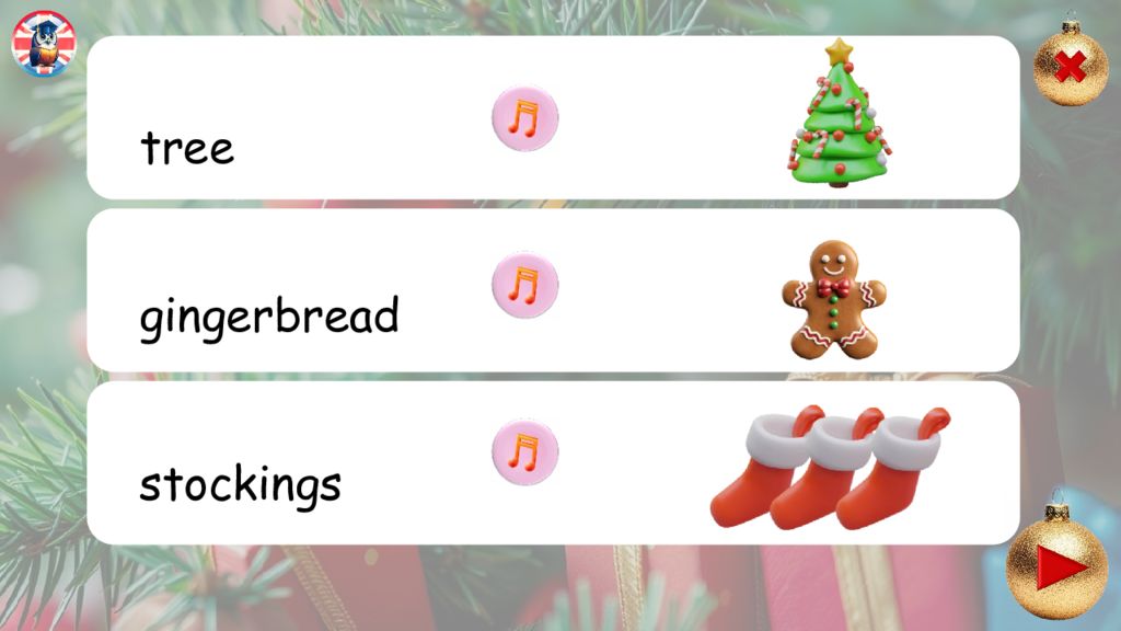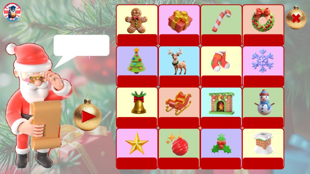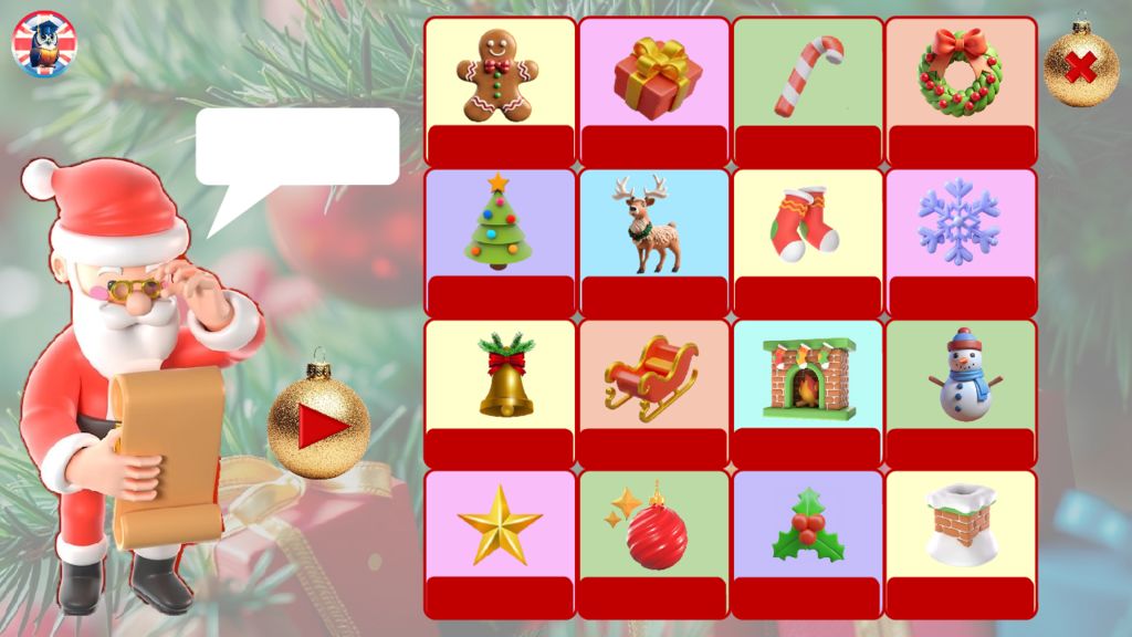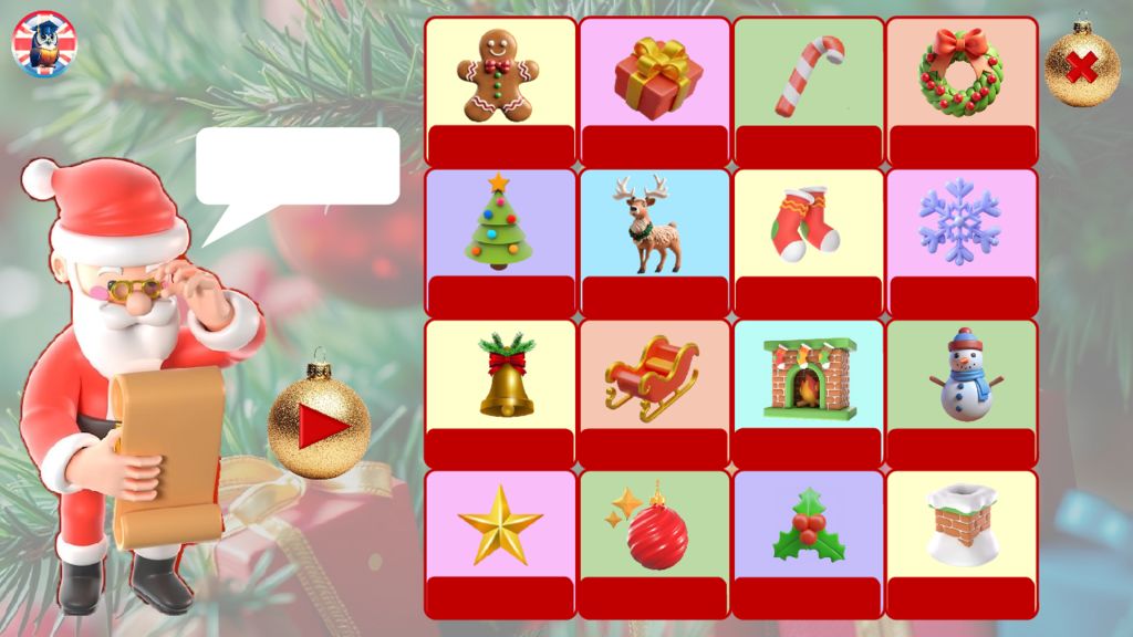 gingerbread present candy cane tree reindeer stockings bell sleigh fireplace star bauble holly wreath snowflake snowman chimney Find and click on the picture