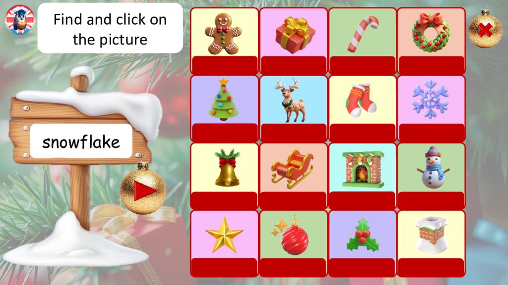 gingerbread present candy cane tree reindeer stockings bell sleigh fireplace star bauble holly wreath snowflake snowman chimney Find and click on the picture snowflake
