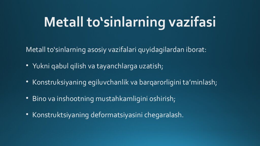 Metall to‘sinlarning asosiy vazifalari quyidagilardan iborat : Yukni qabul qilish va tayanchlarga uzatish ; Konstruksiyaning egiluvchanlik va barqarorligini ta’minlash ; Bino va inshootning mustahkamligini oshirish ; Konstruktsiyaning deformatsiyasini chegaralash.