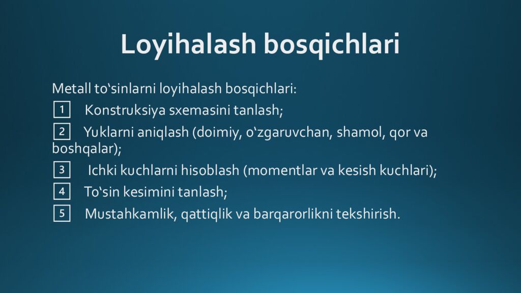 Metall to‘sinlarni loyihalash bosqichlari : 1️⃣ Konstruksiya sxemasini tanlash ; 2️⃣ Yuklarni aniqlash ( doimiy, o‘zgaruvchan, shamol, qor va boshqalar ); 3️⃣ Ichki kuchlarni hisoblash ( momentlar va kesish kuchlari ); 4️⃣ To‘sin kesimini tanlash ; 5️⃣ Mustahkamlik, qattiqlik va barqarorlikni tekshirish.