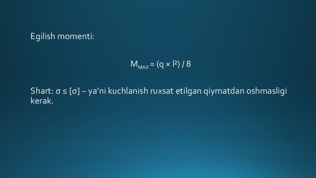 Egilish momenti : M MAX = (q × l²) / 8 Shart : σ ≤ [σ] – ya’ni kuchlanish ruxsat etilgan qiymatdan oshmasligi kerak.