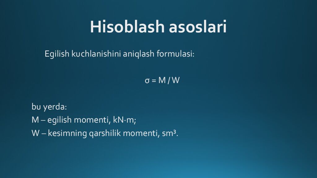 Egilish kuchlanishini aniqlash formulasi : σ = M / W bu yerda : M – egilish momenti, kN·m ; W – kesimning qarshilik momenti, sm³.