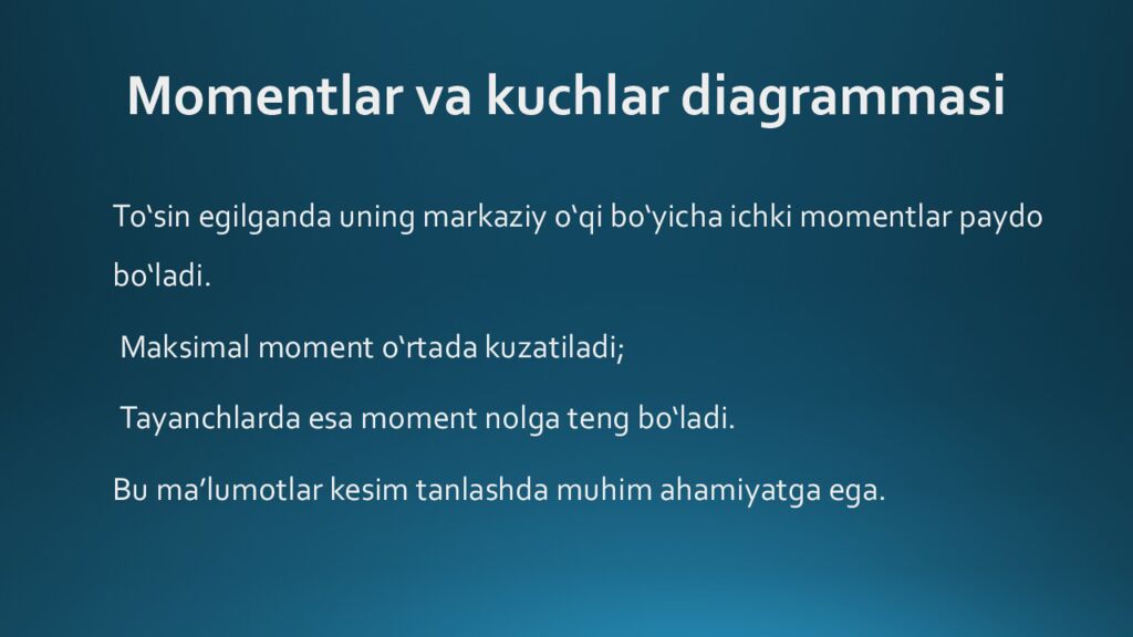 To‘sin egilganda uning markaziy o‘qi bo‘yicha ichki momentlar paydo bo‘ladi. Maksimal moment o‘rtada kuzatiladi ; Tayanchlarda esa moment nolga teng bo‘ladi. Bu ma’lumotlar kesim tanlashda muhim ahamiyatga ega.