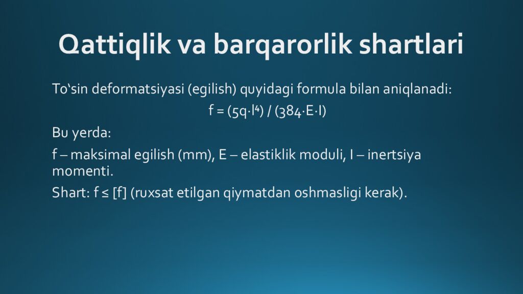 To‘sin deformatsiyasi ( egilish ) quyidagi formula bilan aniqlanadi : f = (5q·l⁴) / (384·E·I) Bu yerda : f – maksimal egilish (mm), E – elastiklik moduli, I – inertsiya momenti. Shart : f ≤ [f] ( ruxsat etilgan qiymatdan oshmasligi kerak ).