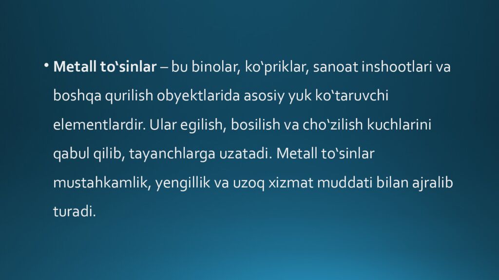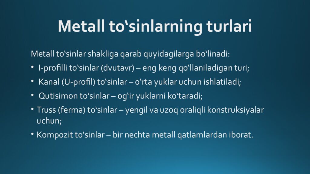 Metall to‘sinlar – bu binolar, ko‘priklar, sanoat inshootlari va boshqa qurilish obyektlarida asosiy yuk ko‘taruvchi elementlardir. Ular egilish, bosilish va cho‘zilish kuchlarini qabul qilib, tayanchlarga uzatadi. Metall to‘sinlar mustahkamlik, yengillik va uzoq xizmat muddati bilan ajralib turadi.