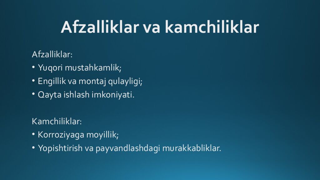 Afzalliklar : Yuqori mustahkamlik ; Engillik va montaj qulayligi ; Qayta ishlash imkoniyati. Kamchiliklar : Korroziyaga moyillik ; Yopishtirish va payvandlashdagi murakkabliklar.