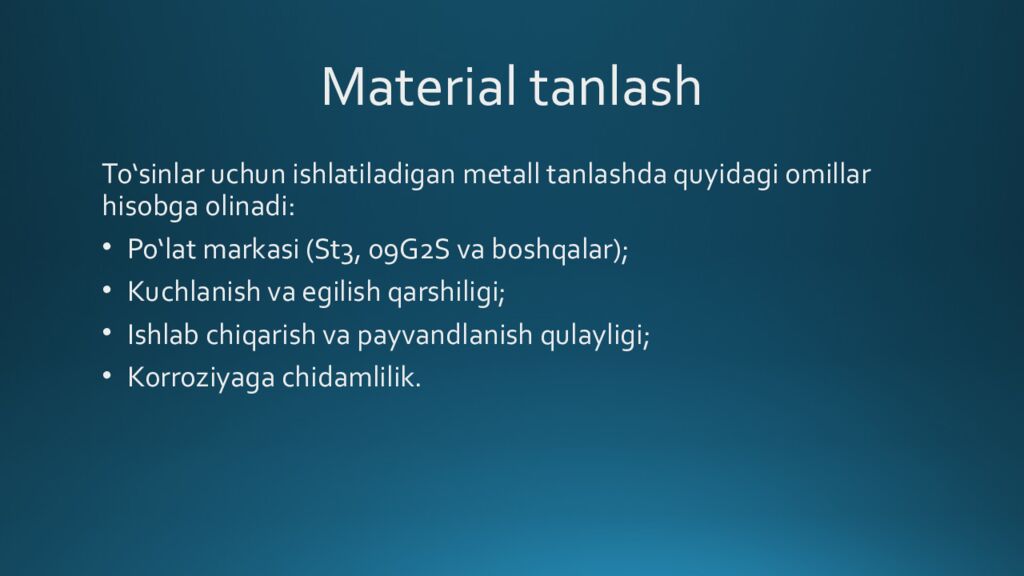 To‘sinlar uchun ishlatiladigan metall tanlashda quyidagi omillar hisobga olinadi : Po‘lat markasi (St3, 09G2S va boshqalar ); Kuchlanish va egilish qarshiligi ; Ishlab chiqarish va payvandlanish qulayligi ; Korroziyaga chidamlilik.