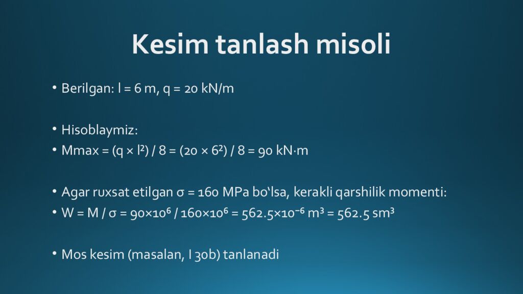 Berilgan : l = 6 m, q = 20 kN /m Hisoblaymiz : Mmax = (q × l²) / 8 = (20 × 6²) / 8 = 90 kN·m Agar ruxsat etilgan σ = 160 MPa bo‘lsa, kerakli qarshilik momenti : W = M / σ = 9 0×10⁶ / 160×10⁶ = 562.5×10⁻⁶ m³ = 562.5 sm³ Mos kesim ( masalan, I 30b) tanlanadi